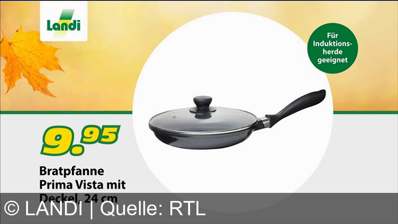 Bratpfanne mit Deckel, 24 cm, für 9,95. Geeignet für Induktionsherde. Links oben das Logo von Landi, rechts ein grün-weißer Kreis mit der Aufschrift „Für Induktionsherde geeignet“. Hintergrund in Gelb-Orange mit einem Ahornblatt.