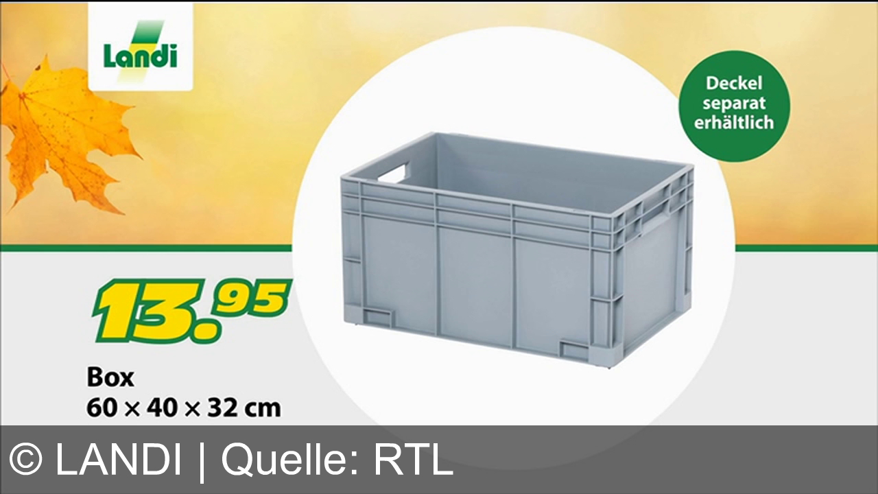Graue Box mit den Maßen 60 x 40 x 32 cm, Preis 13.95. Logo oben links in grün und weiß. Oranges Ahornblatt im Hintergrund. Grüner Kreis mit Text: "Deckel separat erhältlich."