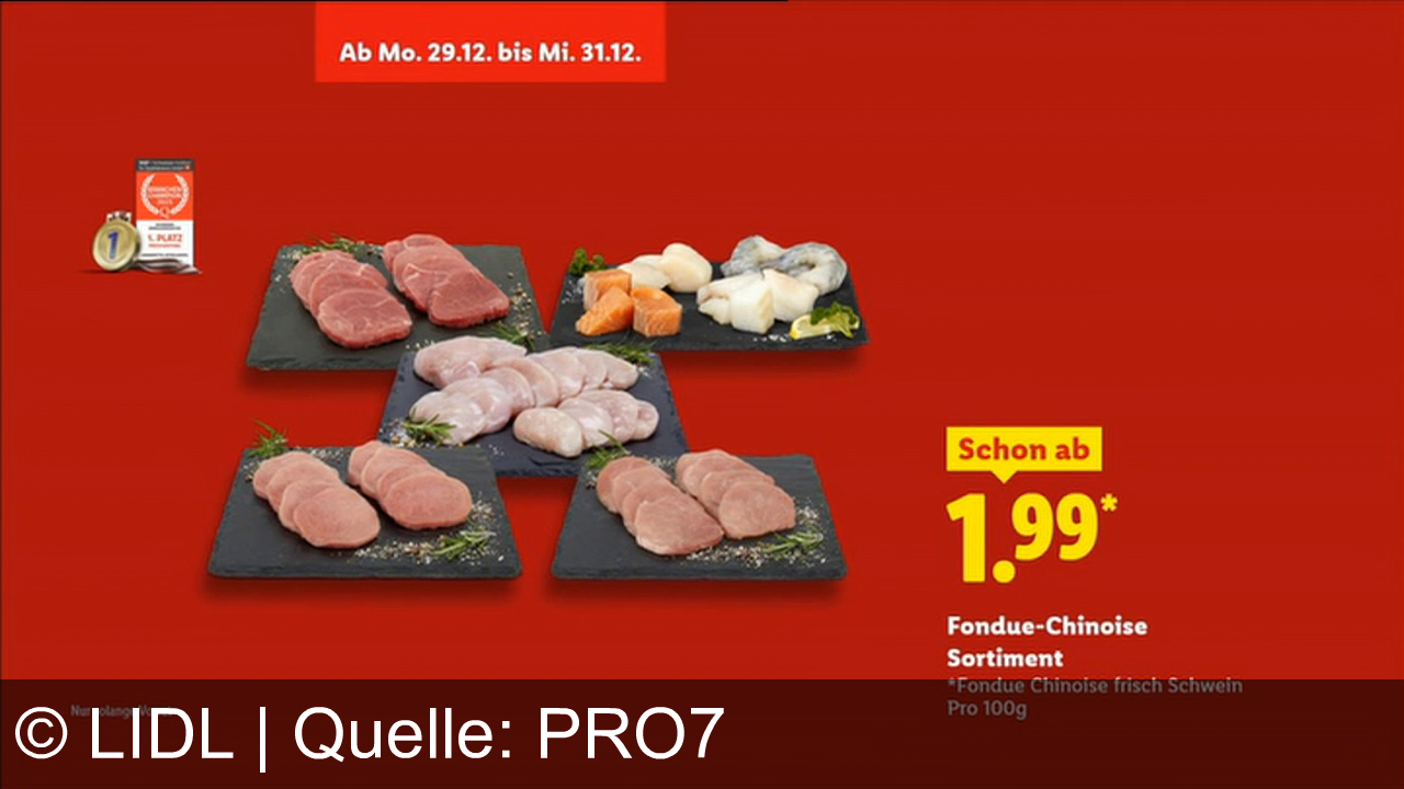 Auf rotem Hintergrund liegen mehrere Schieferplatten mit verschiedenen Fleischsorten. Oben steht "Ab Mo. 29.12. bis Mi. 31.12." Links ist ein Preiszeichen und eins, das "1. Platz" zeigt. Rechts steht der Preis "Schon ab 1.99€" für "Fondue-Chinoise Sortiment" mit einem Hinweis, dass es pro 100g Schweinefleisch gilt. Unten steht "Nur solange Vorrat."