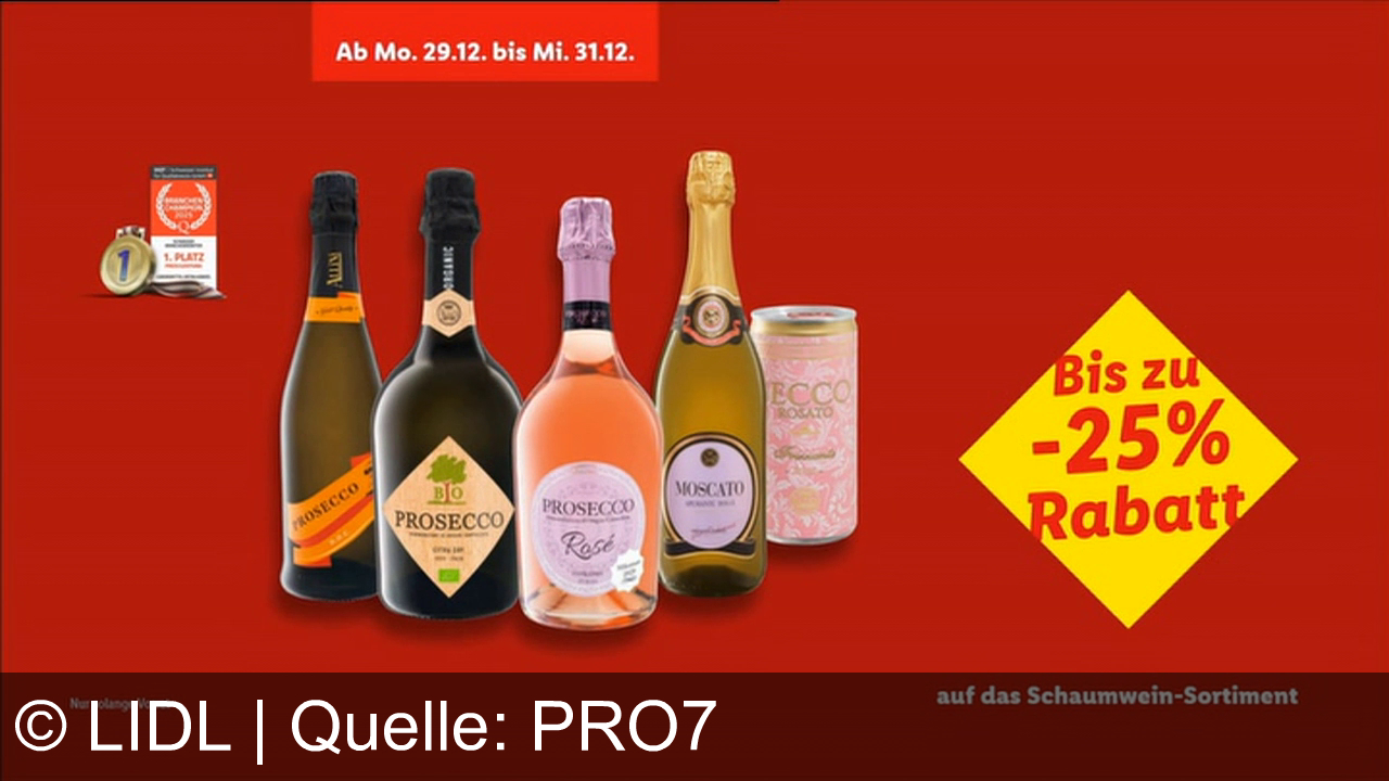 Fünf Flaschen und eine Dose Schaumwein stehen nebeneinander vor einem roten Hintergrund. Oben steht ein Zeitraum, vom 29.12. bis 31.12. Rechts ist ein gelbes Schild mit "Bis zu -25% Rabatt" auf das Schaumwein-Sortiment. Links ein Bild mit Medaille und Text "1. Platz". Unten klein: "Nur solange Vorrat".