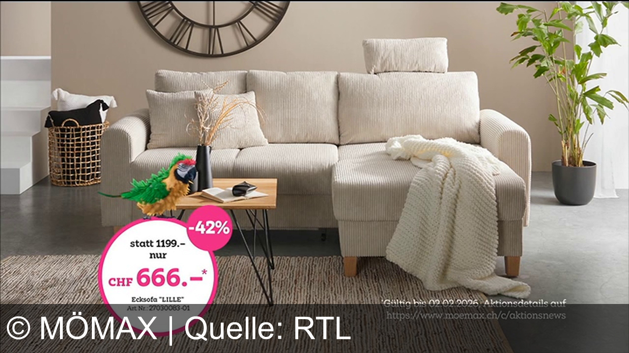 Werbung aus dem Jahr 2025 von Mömax in der Schweiz, mit dem von uns gewählten Titel: "Stylische Möbel zu Tiefpreisen: Trendige Aktionsangebote jetzt bei Mömax entdecken" mit der Kurzbeschreibung: "Entdecke stylische Möbel zu Tiefpreisen bei Mömax! Hol dir das Träne-Geek-Sofa, Kunstfell oder Boxspringbett jetzt zum Angebot. Mömax – das günstigste Trendmöbelhaus!". Diese Werbung thematisiert oder beinhaltet die Kategorie/n Sofa, Teppich, Bett.