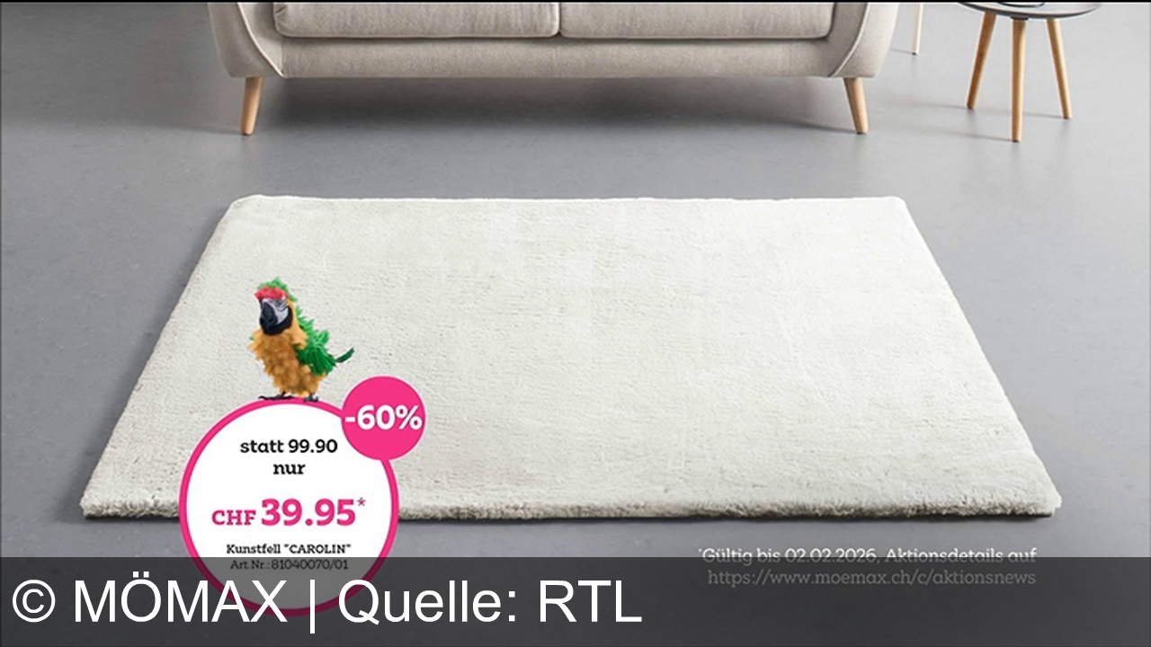 Ein heller Teppich liegt auf einem grauen Boden, dahinter steht ein Sofa. Auf dem Teppich sitzt ein bunter Papagei. Links unten ist ein Rabattangebot: Statt CHF 99,90, kostet der Teppich nur CHF 39,95, mit 60% Rabatt. Der Teppich heißt "CAROLIN". Die Aktion ist gültig bis 02.02.2026. Tische mit Holzbeinen sind im Hintergrund sichtbar.
