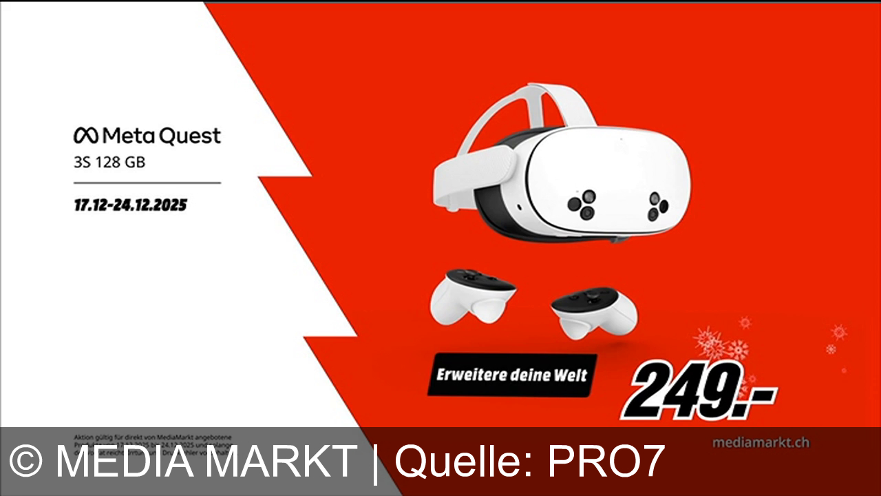 Meta Quest 3S 128 GB und Controller auf rotem Hintergrund. Angebot vom 17.12. bis 24.12.2025 für 249.- CHF. Slogan: "Erweitere deine Welt". Schnee-Design-Elemente und MediaMarkt-Logo. Website angegeben: mediamarkt.ch.