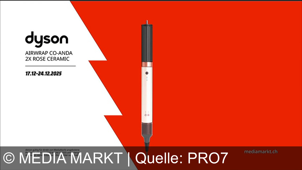 Ein roter Hintergrund mit einem Dyson Airwrap Co-Andas in der Mitte, rechts die Website media markt.ch. Links steht "Dyson Airwrap Co-Anda 2X Rose Ceramic" und das Datum "17.12-24.12.2025". Unten ist ein Hinweis auf die Aktion.