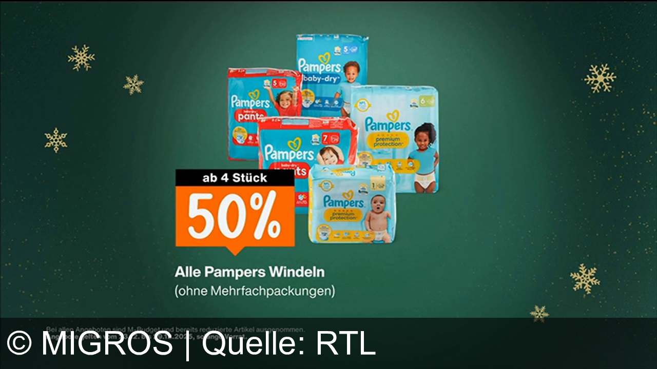 Pampers Windelpakete auf einem grünen Hintergrund mit Schneeflocken. Angebot: ab 4 Stück 50% Rabatt auf alle Pampers Windeln (ohne Mehrfachpackungen). Gültig vom 23.12. bis 29.12.2025, solange der Vorrat reicht. Untere Schrift klärt über Ausnahmen und Einschränkungen auf.