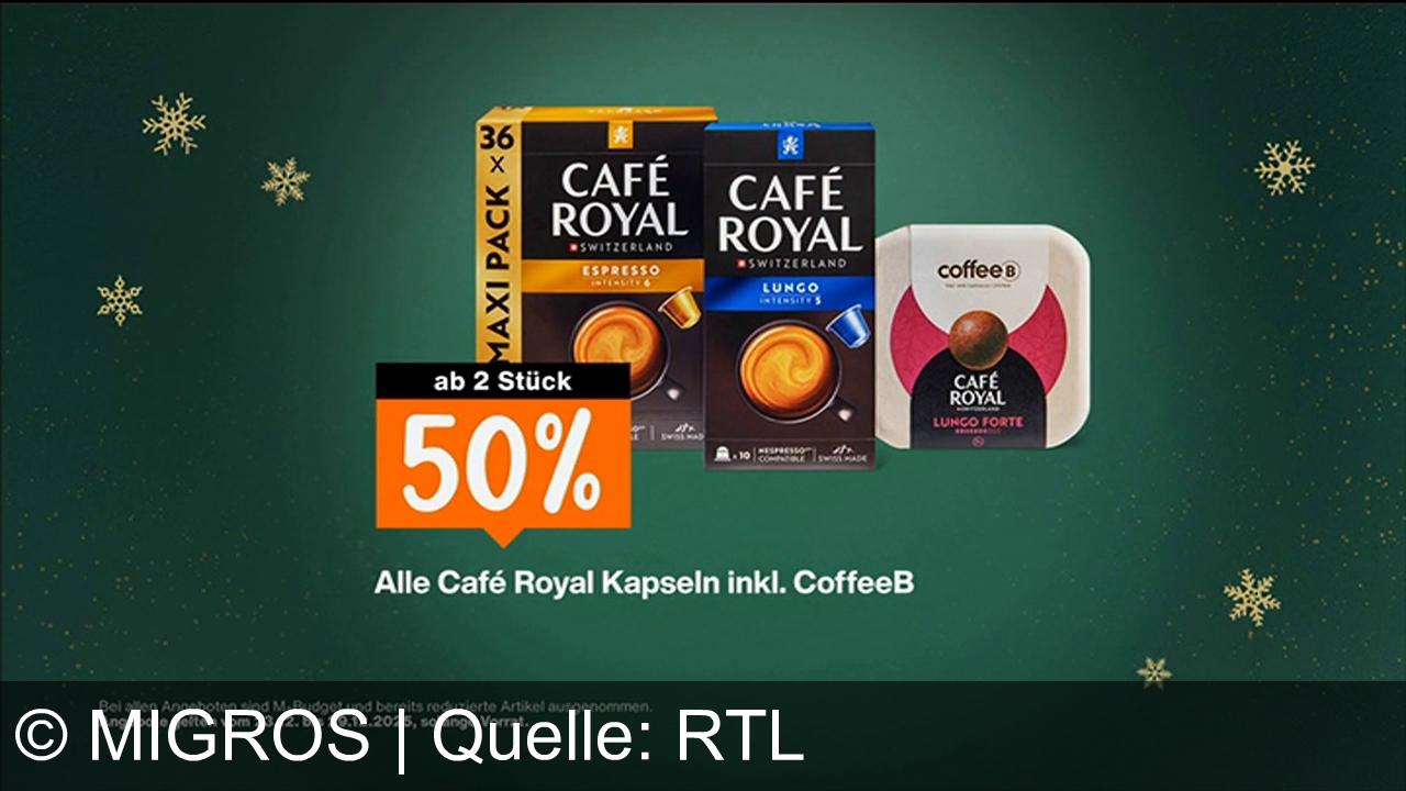 Café Royal Kaffeekapseln abgebildet. 50% Rabatt ab Kauf von 2 Stück. Inkl. CoffeeB. Dunkelgrüner Hintergrund mit goldenen Schneeflocken. Angebot gültig vom 23.12. bis 29.12.2025, solange Vorrat reicht.