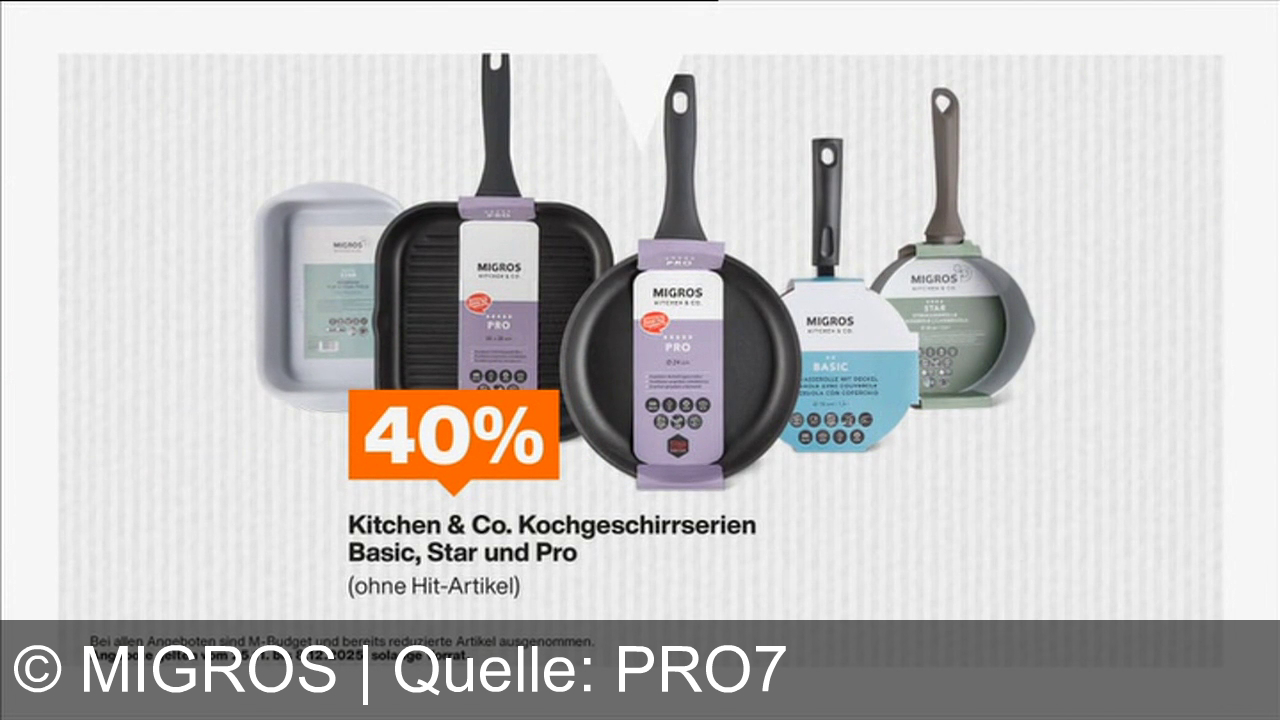 Fünf verschiedene Pfannen und Töpfe von Migros Kitchen & Co, Serien Basic, Star und Pro. Aufkleber an den Produkten zeigen diverse Informationen. Im Vordergrund ein orangefarbenes Schild mit 40% Rabatt. Kleingedruckter Text unten beschreibt Angebotsbedingungen und Gültigkeitszeitraum vom 25.11. bis 8.12.2025, solange Vorrat reicht.