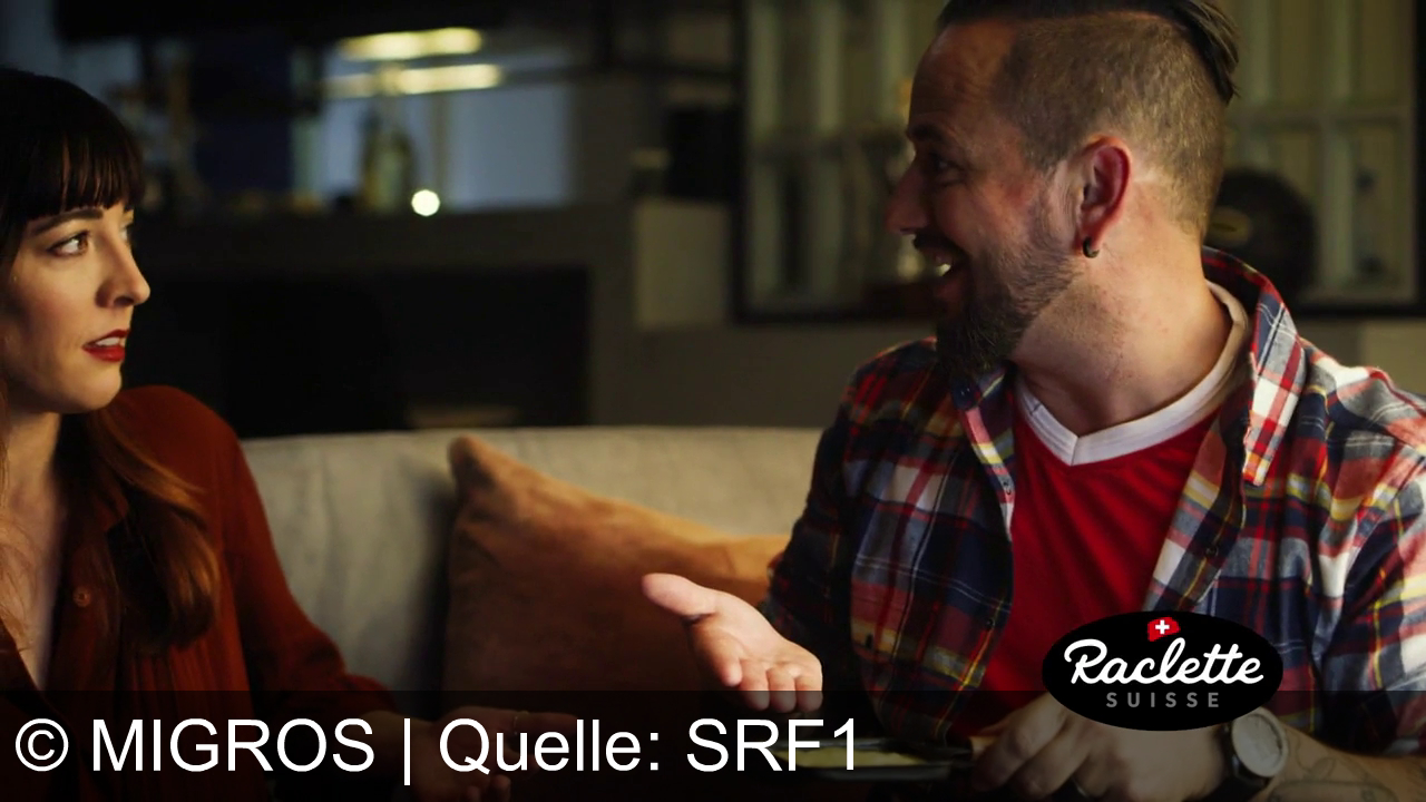 Ein Mann und eine Frau sitzen auf einem Sofa. Die Frau trägt ein rotbraunes Oberteil, der Mann ein kariertes Hemd über einem roten T-Shirt. Er hält einen kleinen Teller mit Essen in der Hand und gestikuliert. Sie schauen sich gegenseitig an. Im Bild ist das Logo „Raclette Suisse“ eingeblendet. Im Hintergrund sind unscharfe Details eines Raums zu sehen.