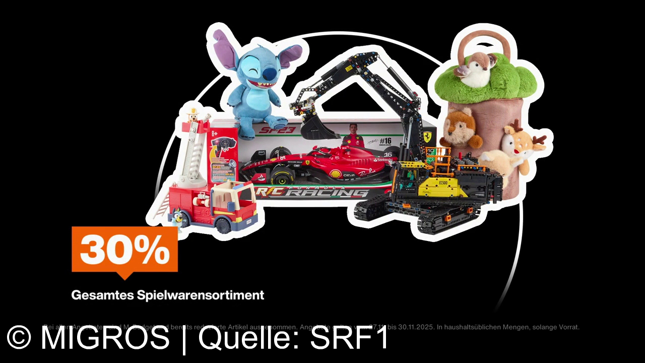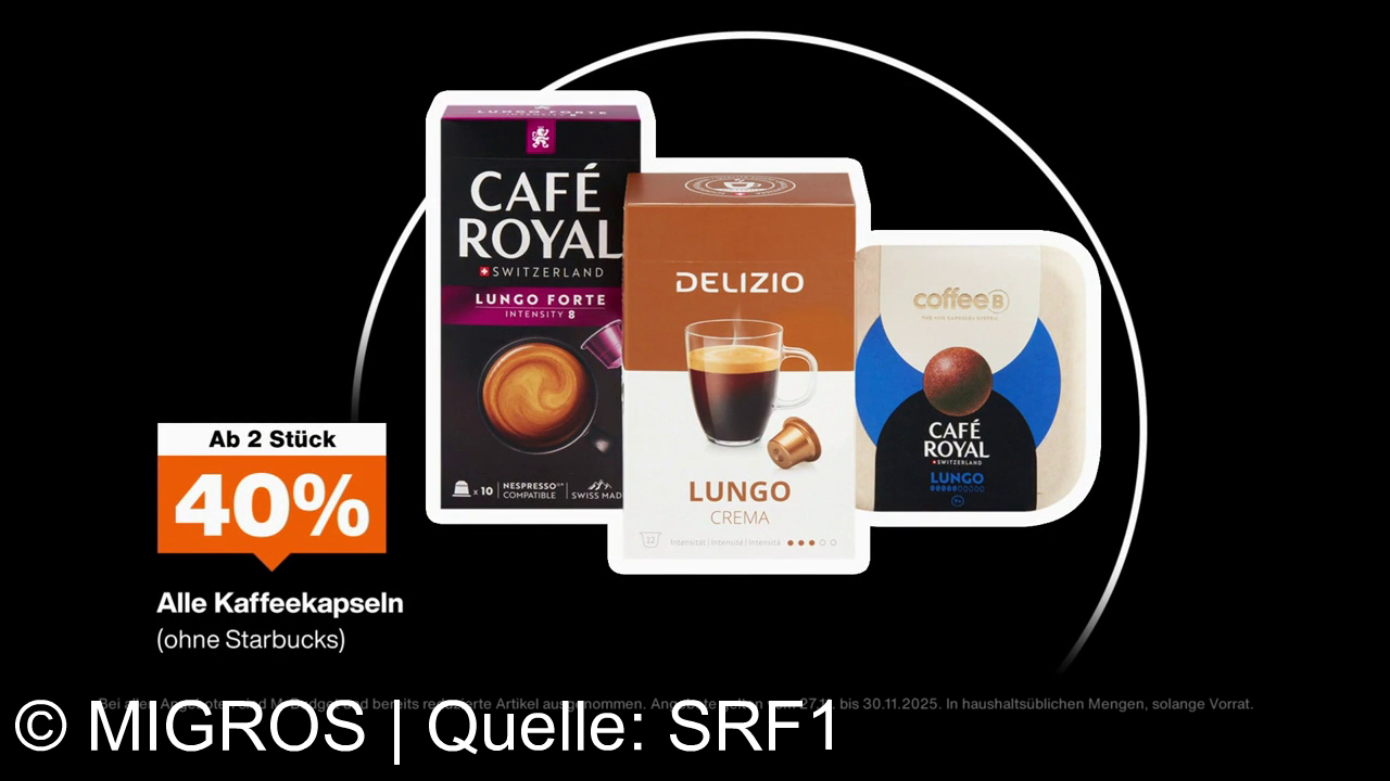 Migros bewirbt zum Black Friday Rabatte: 30% auf alle Spielwaren, 40% auf Kaffeekapseln (ab 2 Stück) und 40% auf das gesamte Sortiment an Erwachsenenbekleidung. Die Aktion gilt vom 27.11. bis 30.11.2025, solange Vorrat reicht.