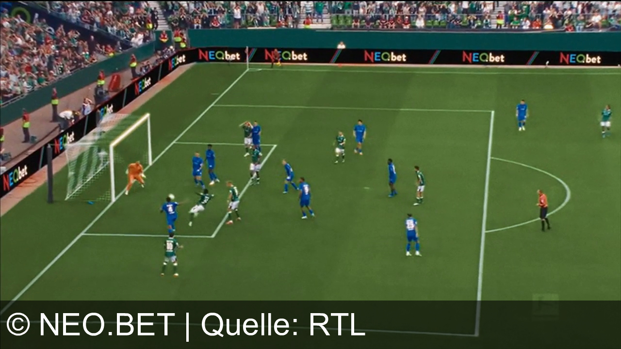 Ein Fußballspieler in grün-weiß springt in der Nähe des Tores. Der Torwart in Orange ist bereit zum Abwehren. Mehrere Spieler in Blau stehen im Strafraum. Ein Schiedsrichter in Rot steht weiter entfernt am Spielfeldrand. Zuschauer im Stadionhintergrund. LED-Werbebanner am Spielfeldrand mit "NEQbet" sichtbar.
