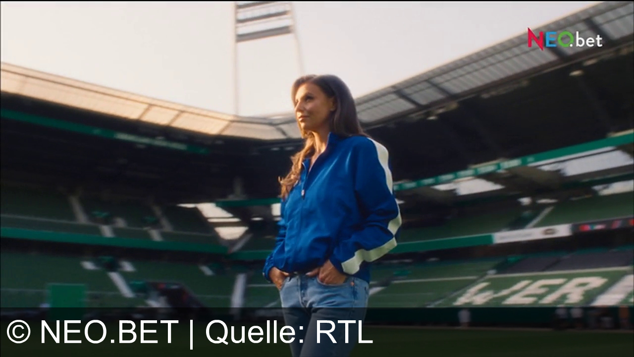 Eine Frau steht in einem leeren Fußballstadion. Sie trägt eine blaue Jacke und Jeans. Ihre Hände sind in den Jackentaschen. Im Hintergrund erkennt man Tribünen und ein Dach. Oben rechts im Bild steht "NEO.bet". Die Lichtverhältnisse suggerieren Tageslicht oder Sonnenuntergang.