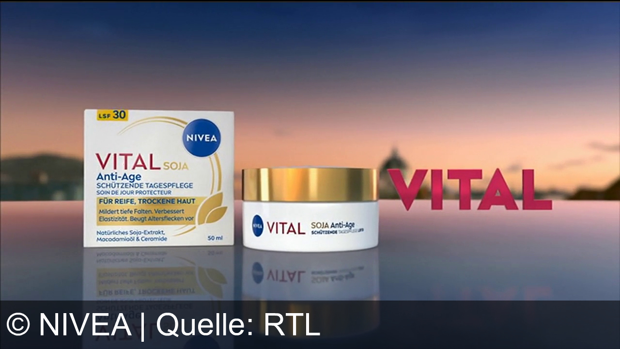 Nivea bewirbt die Vital Soja Tagespflege mit Soja-Extrakt und LSF 30. Die Creme vitalisiert, strafft reife Haut und schützt vor UV-Strahlen. Die Werbebotschaft: Hautalterung ist Stärke – Nivea unterstützt sichtbare und fühlbare Hautstärke jeden Tag.