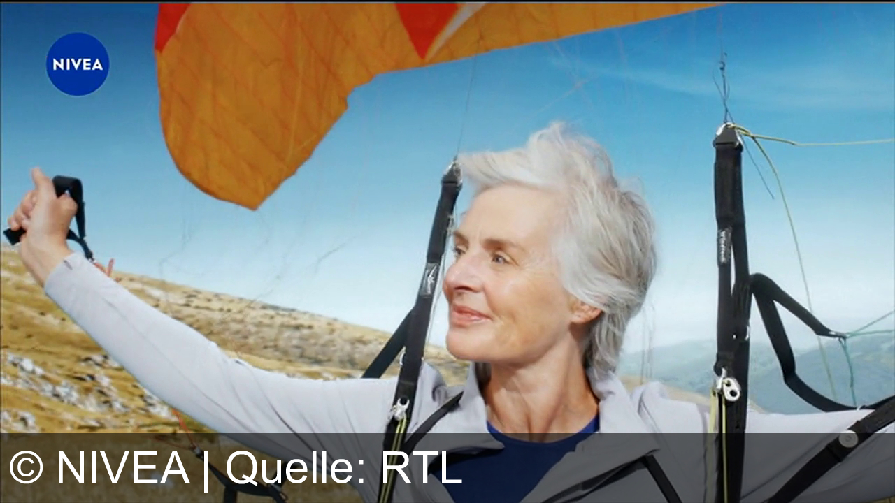 Eine Frau mit grauen Haaren trägt eine Paragleiter-Ausrüstung mit einem orangefarbenen Schirm. Sie lächelt und schaut nach rechts. Im Hintergrund sind ein blauer Himmel und eine Landschaft mit Gras und Felsen zu sehen. Links oben befindet sich das NIVEA-Logo.