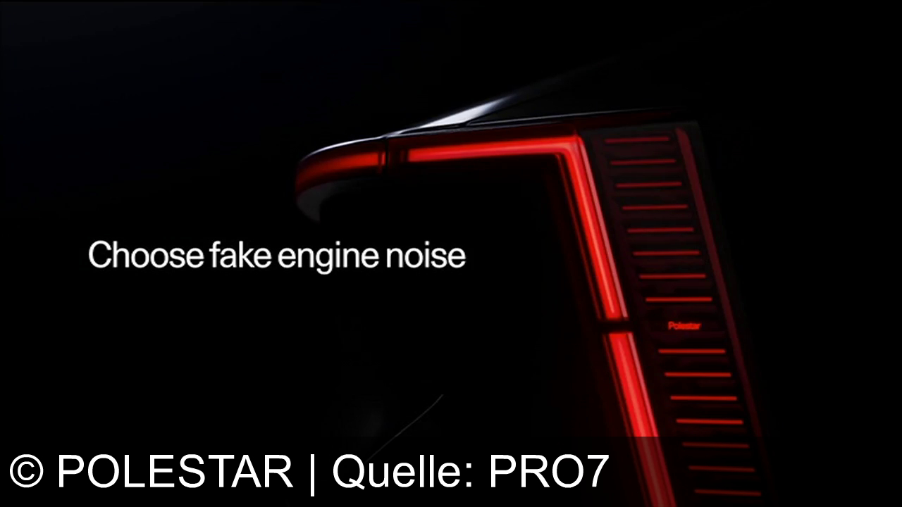 Ein Autolleuchten-Detail mit roter Linse auf dunklem Hintergrund. Text links sagt "Choose fake engine noise". Unten steht "Polestar".