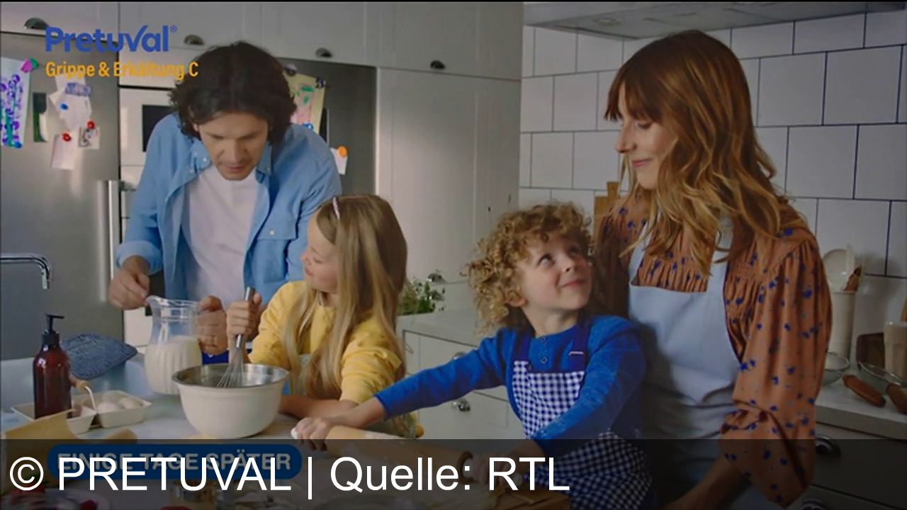 Eine Familie steht in der Küche. Zwei Erwachsene und zwei Kinder bereiten Essen vor. Ein Kind rührt in einer Schüssel, das andere benutzt ein Nudelholz. Die Erwachsenen schauen den Kindern zu. Im Hintergrund hängen Zeichnungen an der Wand. Links oben steht "PrettyVal Grippe & Erkältung C" und unten "EINIGE TAGE SPÄTER".