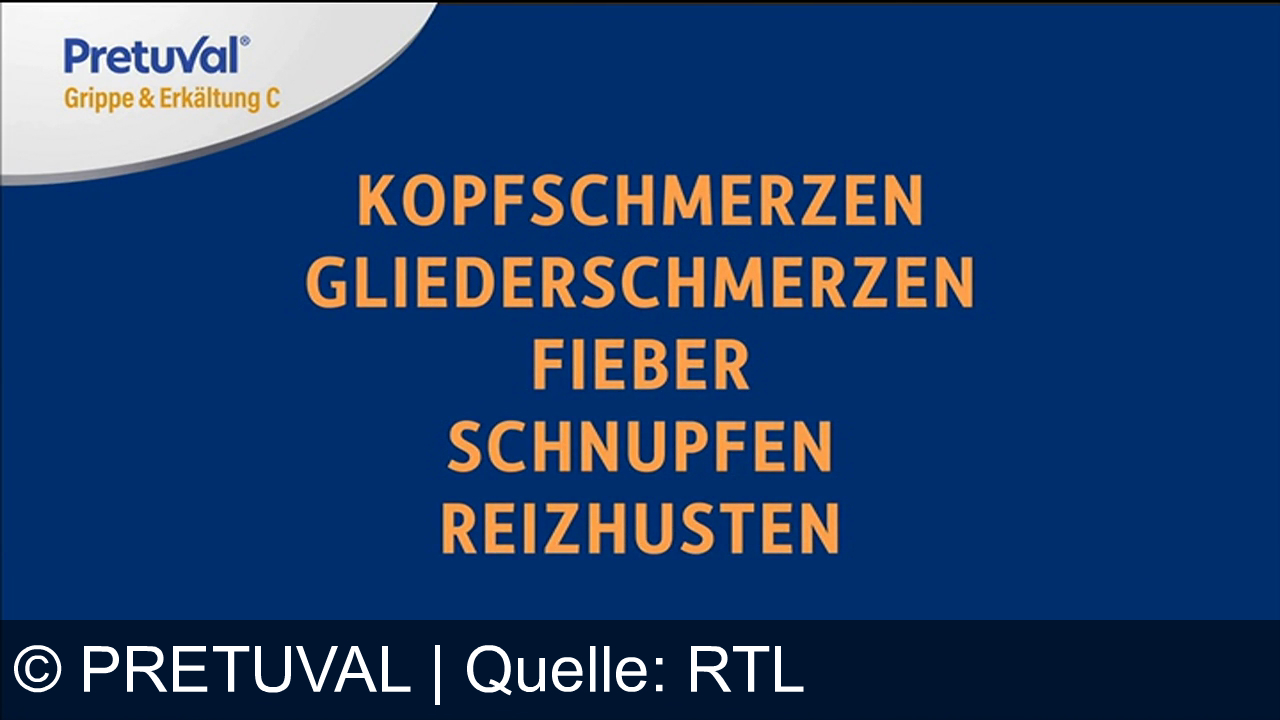 Blauer Hintergrund, orangefarbener Text: "Kopfschmerzen, Gliederschmerzen, Fieber, Schnupfen, Reizhusten". Oben links "Pretuval, Grippe & Erkältung C" in einem weißen Bereich.