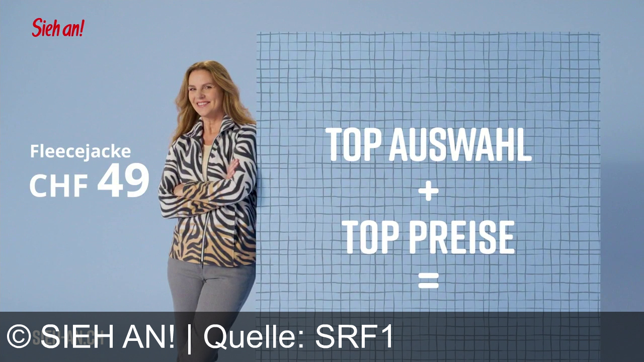 Eine Frau trägt eine gemusterte Fleecejacke. Der Preis von 49 CHF ist zu sehen. Rechts im Bild steht "Top Auswahl + Top Preise". Der Hintergrund ist blau mit einem Raster. Links oben steht "Sieh an!" und unten "SIEH-AN.CH".