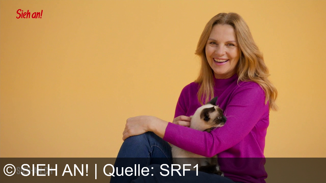 Eine lächelnde Frau sitzt vor einem gelben Hintergrund. Sie trägt einen lila Pullover und blaue Jeans. Auf ihrem Schoß hält sie eine Siamkatze. Links oben steht der Text "Sieh an!" in roter Schrift. Unten links sieht man "SIEH-AN.CH".