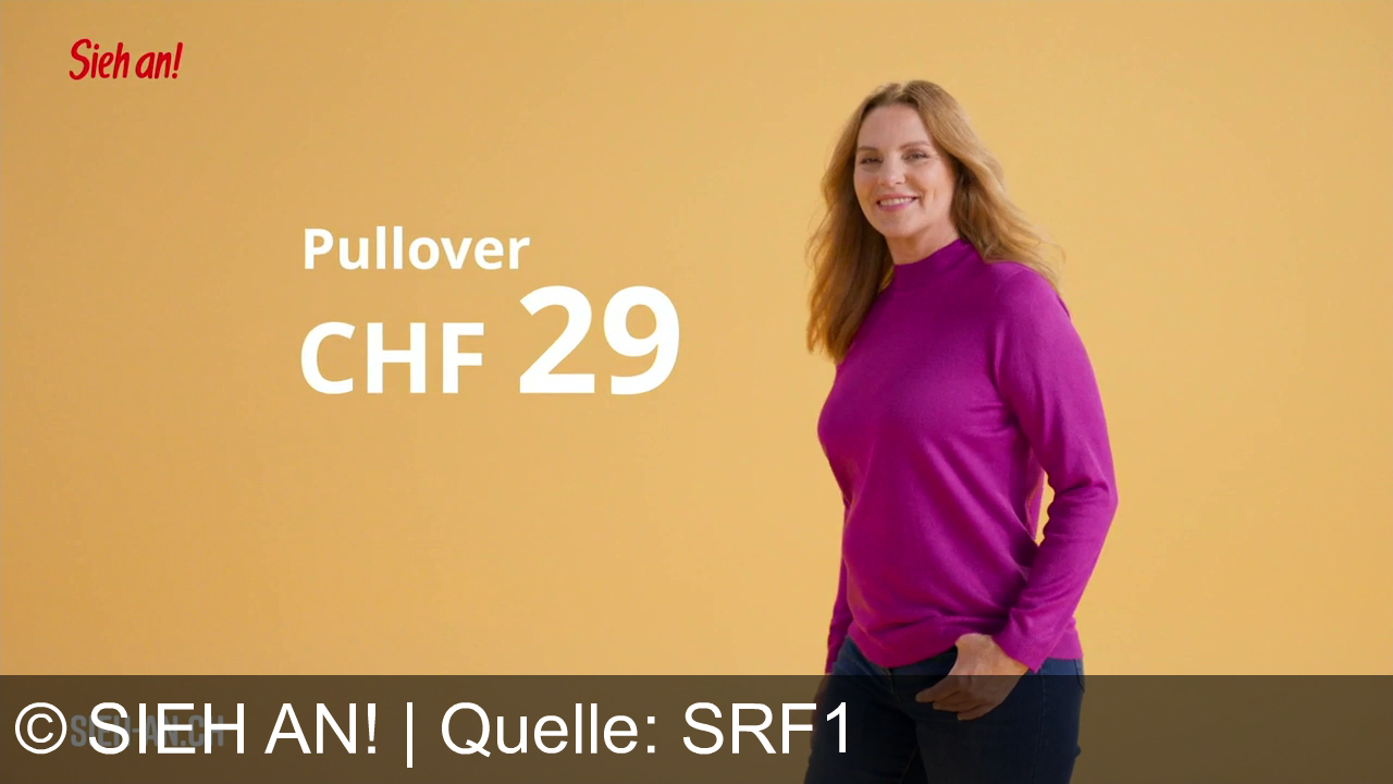 Frau in pinkem Pullover vor gelbem Hintergrund. Preis: CHF 29. Logo "Sieh an!" oben links, Website unten links.