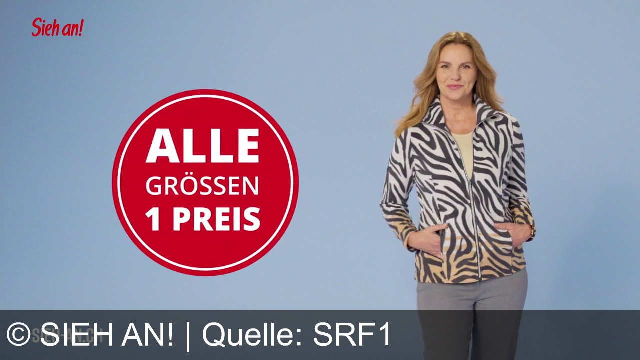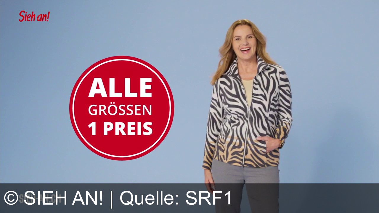 Eine lächelnde Frau mit langem Haar trägt eine Jacke mit Zebramuster und graue Hose vor einem blauen Hintergrund. Links ein roter Kreis mit der Aufschrift "Alle Größen 1 Preis". Oben links steht "Sieh an!", unten links "SIEH-AN.CH".