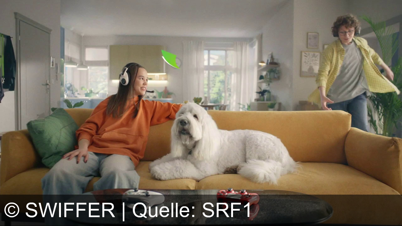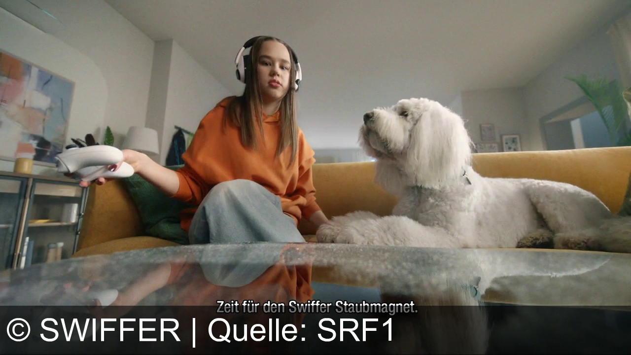 Werbung aus dem Jahr 2025 von Swiffer in der Schweiz, mit dem von uns gewählten Titel: "Swiffer Staubmagnet: Schnell & Mühelos Staub Entfernen – Mehr Zeit für Freizeit!" mit der Kurzbeschreibung: "Game over für Staub! Mit dem Swiffer Duster wird dein Zuhause schnell wieder sauber. Effektiv bei 100% Staub – der Staubmagnet für schwer erreichbare Stellen. Swiffer – sauber in Sekunden!". Diese Werbung thematisiert oder beinhaltet die Kategorie/n Reinigung, Hund, Sofa.