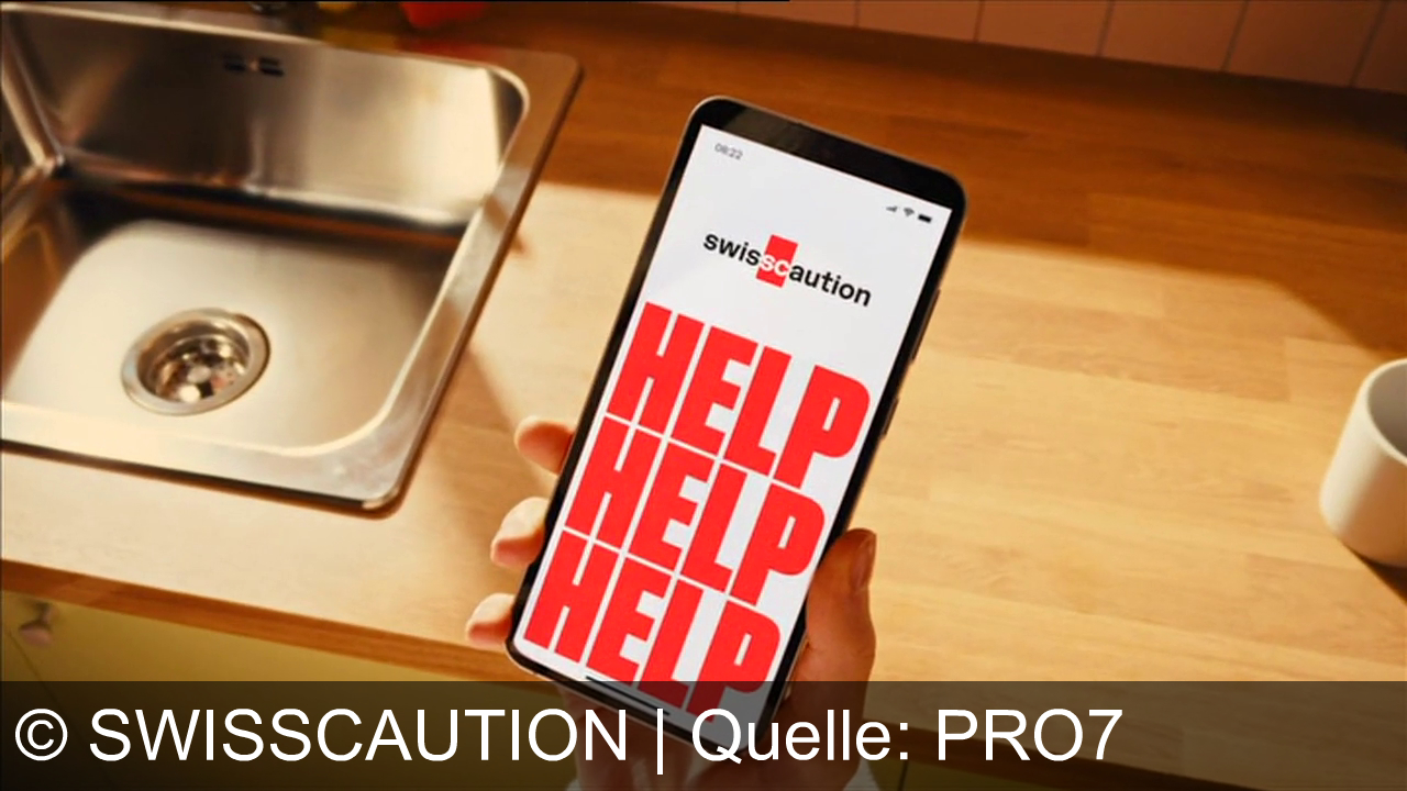 Eine Hand hält ein Handy über einer Küche mit Spüle und Holzarbeitsplatte. Auf dem Display steht oben swisscaution und darunter dreimal fett HELP in Rot. Rechts steht eine weiße Tasse.