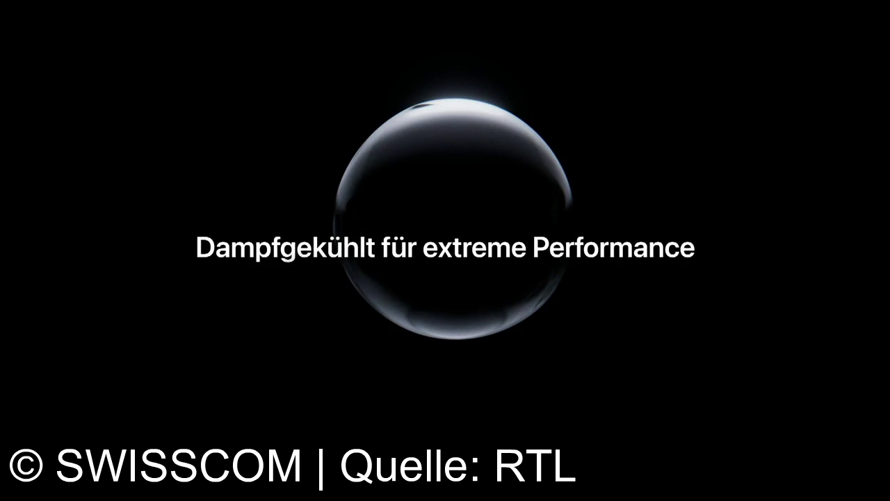 Ein schwarzer Hintergrund mit einem glänzenden, runden Objekt in der Mitte. Darunter steht der Text „Dampfgekühlt für extreme Performance“ in weißer Schrift.