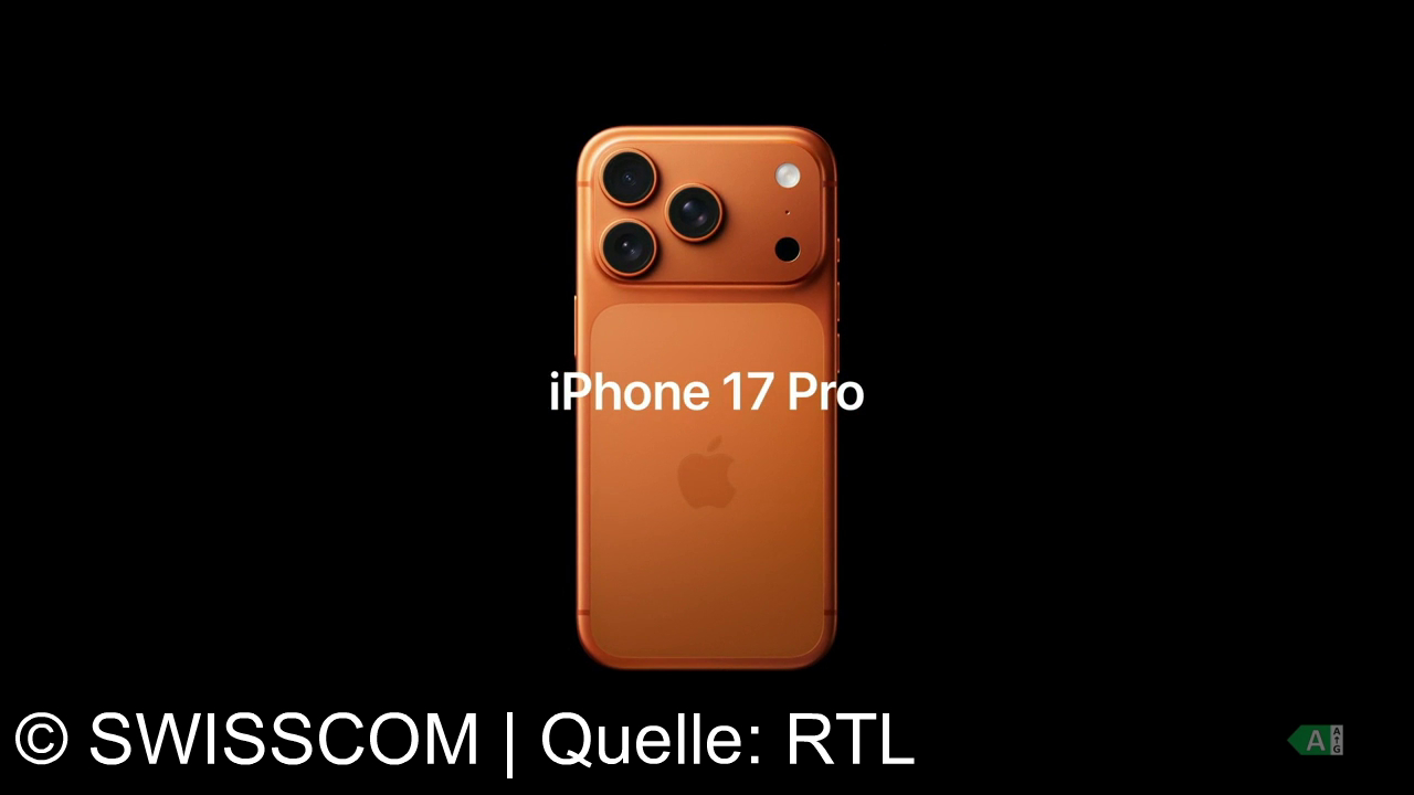 Ein orangefarbenes Smartphone, das iPhone 17 Pro, mit drei Kameralinsen und einem Blitz auf schwarzem Hintergrund. Der Markenname steht zentral über dem Gerät. Unten rechts ist eine kleine grüne Logo-Markierung zu sehen.