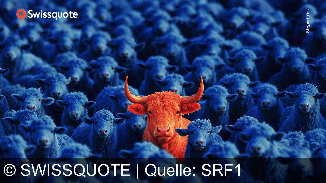 Ein orangefarbener Stier steht inmitten einer Herde blauer Schafe. Links oben steht "Swissquote" und rechts "KI-generiert".
