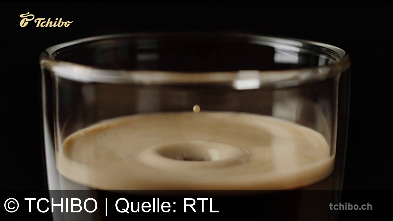 Ein Glas mit schwarzem Kaffee, oben Schaum, Wellentropfen in der Mitte. Markenname Tchibo oben links. Website "tchibo.ch" unten rechts. Schwarzer Hintergrund.