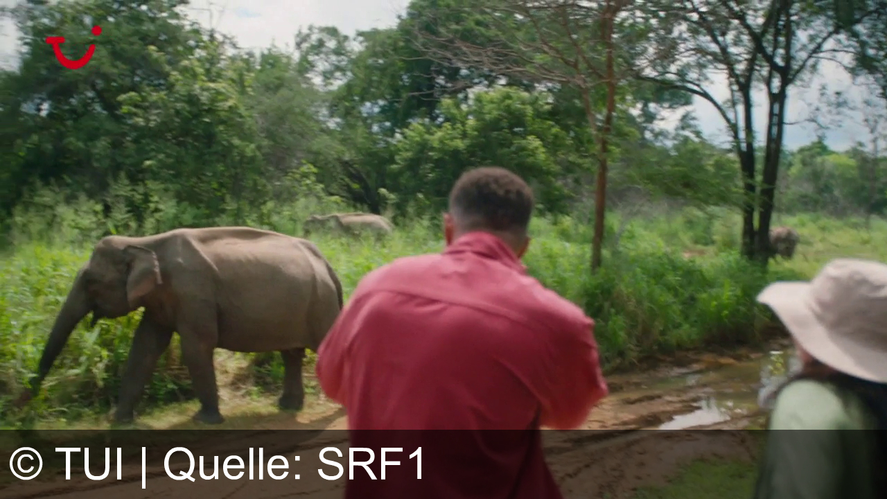 Ein Mann in rotem Hemd steht in einem grünen, dschungelartigen Gebiet und fotografiert einen Elefanten. Ein weiterer Elefant ist im Hintergrund, und daneben steht eine Person mit Hut. Oben links das TUI-Logo. Die Szene zeigt eine Begegnung in der Natur.