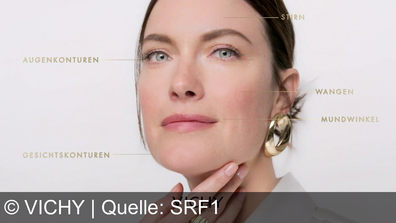 Eine Frau schaut nach rechts. Sie trägt goldene Ohrringe. Ihre Hand berührt ihr Kinn. Wörter wie "Augenkonturen", "Stirn", "Wangen", "Mundwinkel" und "Gesichtskonturen" sind um das Gesicht herum angeordnet. Unten steht "Vichy Laboratoires".