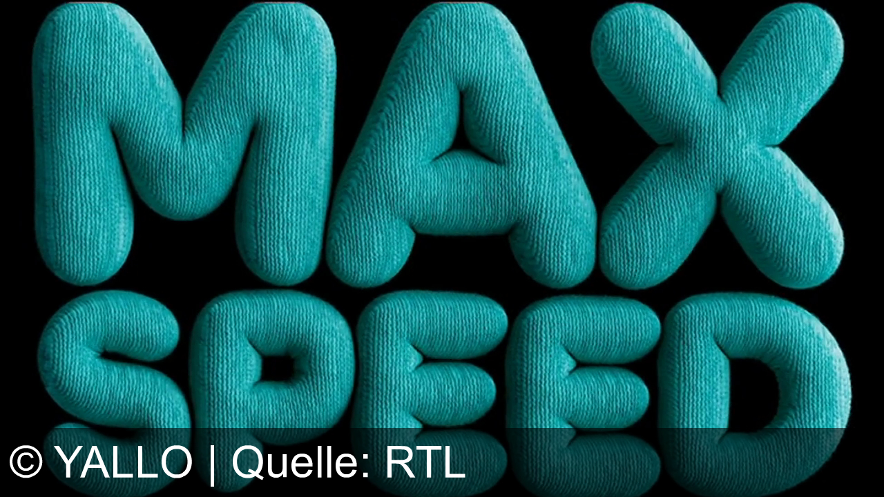 Große, türkisfarbene, gepolsterte Buchstaben formen die Wörter "MAX SPEED" auf schwarzem Hintergrund. Die Textur der Buchstaben erinnert an ein gestricktes Material.