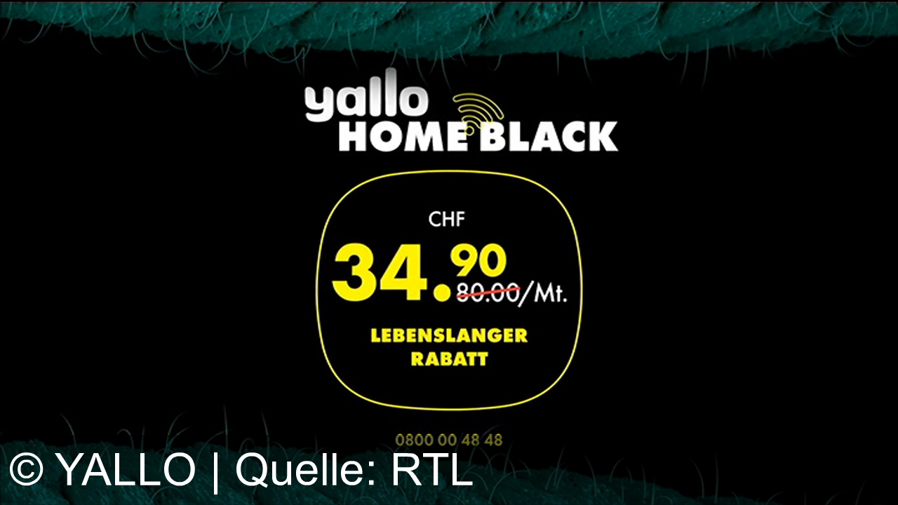 Yallo bewirbt mit „Home Black“ das schnellste Internet für zuhause zum dauerhaften Preis von 34,90 €/Monat. Die Werbebotschaft hebt Maximalgeschwindigkeit, Lebenslangen Rabatt und zeitlich begrenzte Verfügbarkeit hervor. Nur auf yallo.ch erhältlich.