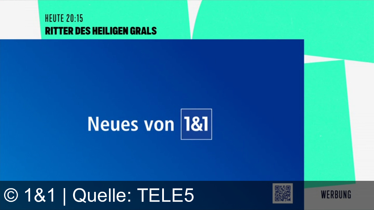 Oben links steht "HEUTE 20:15 RITTER DES HEILIGEN GRALS" auf grünem Hintergrund. Im Zentrum auf blauem Grund steht "Neues von 1&1" mit einem danebenliegenden weißen Quadrat um "1&1". Unten rechts ist ein QR-Code und das Wort "WERBUNG".