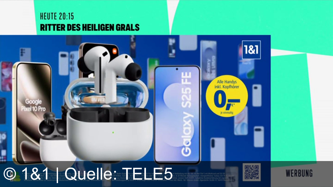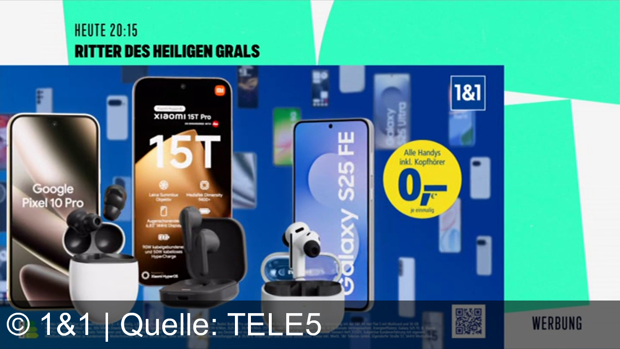 Smartphones von Google, Xiaomi und Samsung sind nebeneinander zu sehen. Daneben befinden sich kabellose Kopfhörer. Rechts ein gelber Kreis mit "Alle Handys inkl. Kopfhörer 0,- € je einmalig". Im Hintergrund ein blauer Bildschirm und das Logo von 1&1. Oben links steht "HEUTE 20:15 RITTER DES HEILIGEN GRALS". Unten rechts "WERBUNG".