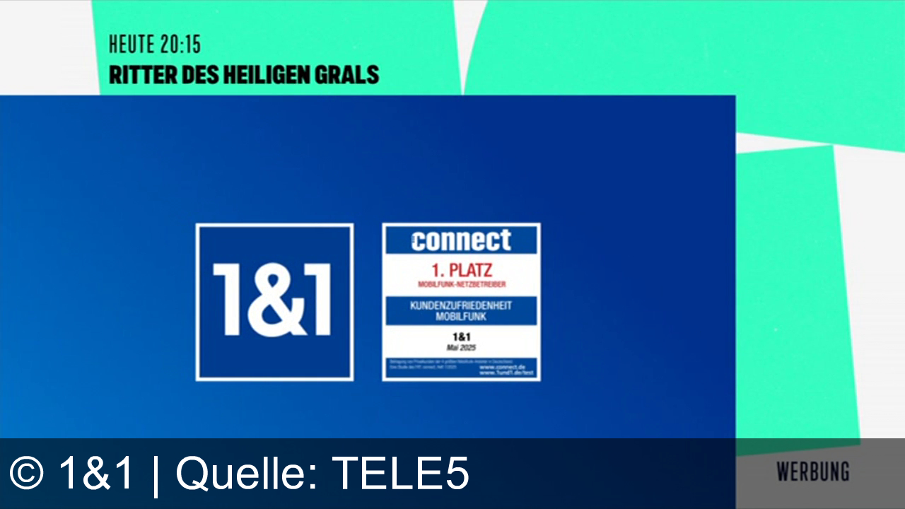Oben links steht "HEUTE 20:15 RITTER DES HEILIGEN GRALS" auf grünem Hintergrund. Darunter ein blaues Feld mit dem 1&1-Logo und einer Auszeichnung von "connect": "1. PLATZ Mobilfunk-Netzbetreiber". Rechts unten das Wort "WERBUNG" auf weißem Hintergrund.