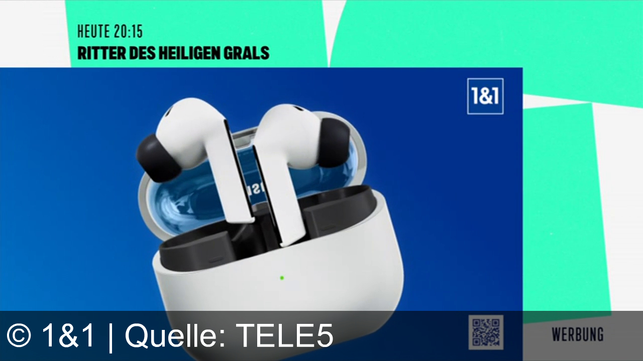 Ein Paar weiße kabellose Ohrhörer in einem offenen Ladecase auf blauem Hintergrund. Oben links steht „HEUTE 20:15 RITTER DES HEILIGEN GRALS“. Rechts oben ein Logo mit „1&1“. Unten rechts ein QR-Code und das Wort „WERBUNG“.