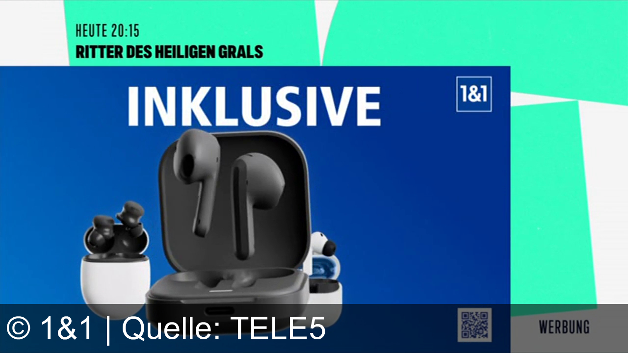 Auf einem blauen Hintergrund sieht man ein offenes schwarzes Etui mit kabellosen Earbuds. Darüber steht "INKLUSIVE" in weißer Schrift. Oben links ist eine Sendungsankündigung für "Ritter des heiligen Grals". Rechts oben ist das 1&1-Logo und unten rechts steht "WERBUNG" mit einem QR-Code.