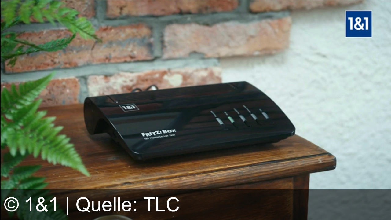 Eine Fritz!Box steht auf einem Holztisch vor einer Ziegelwand. Links im Bild sind ein paar grüne Pflanzenblätter zu sehen. Oben rechts ist ein 1&1-Logo abgebildet.