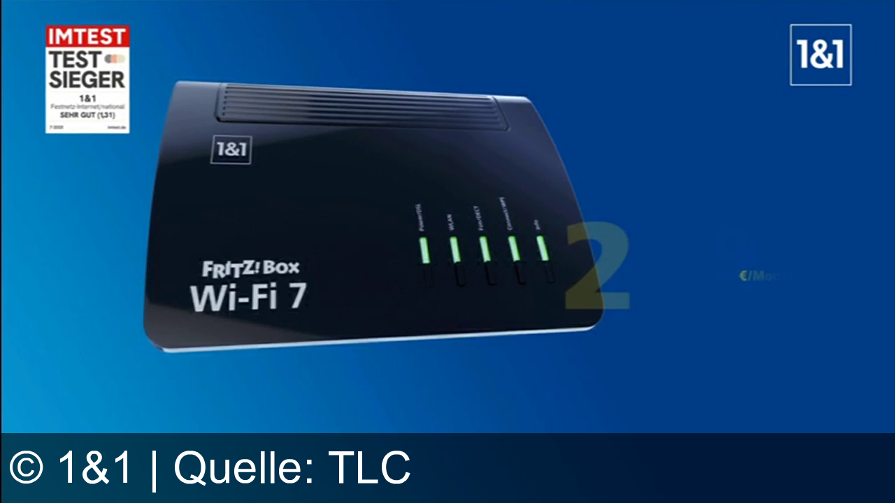 Ein schwarzer Router mit der Aufschrift "FRITZ!Box Wi-Fi 7" und dem Logo von "1&1". Links ein "IMTEST" Testsieger-Label. Hintergrund in Blau, oben rechts ein kleines "1&1" Logo.