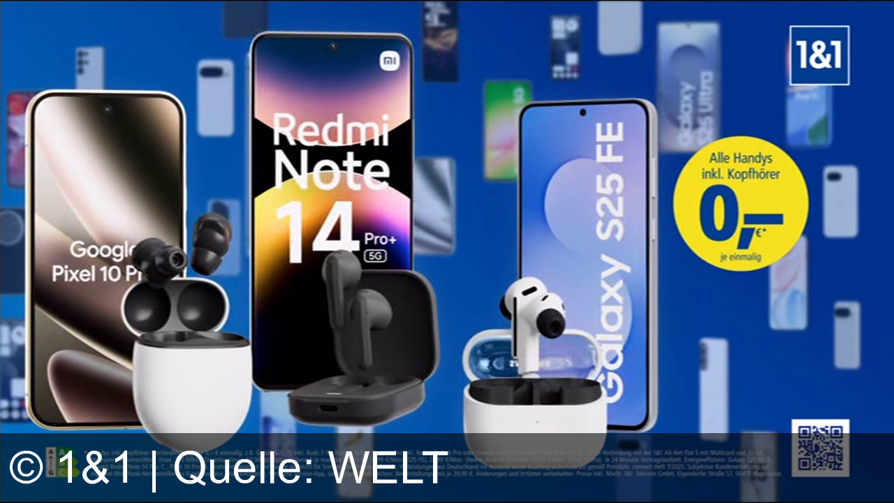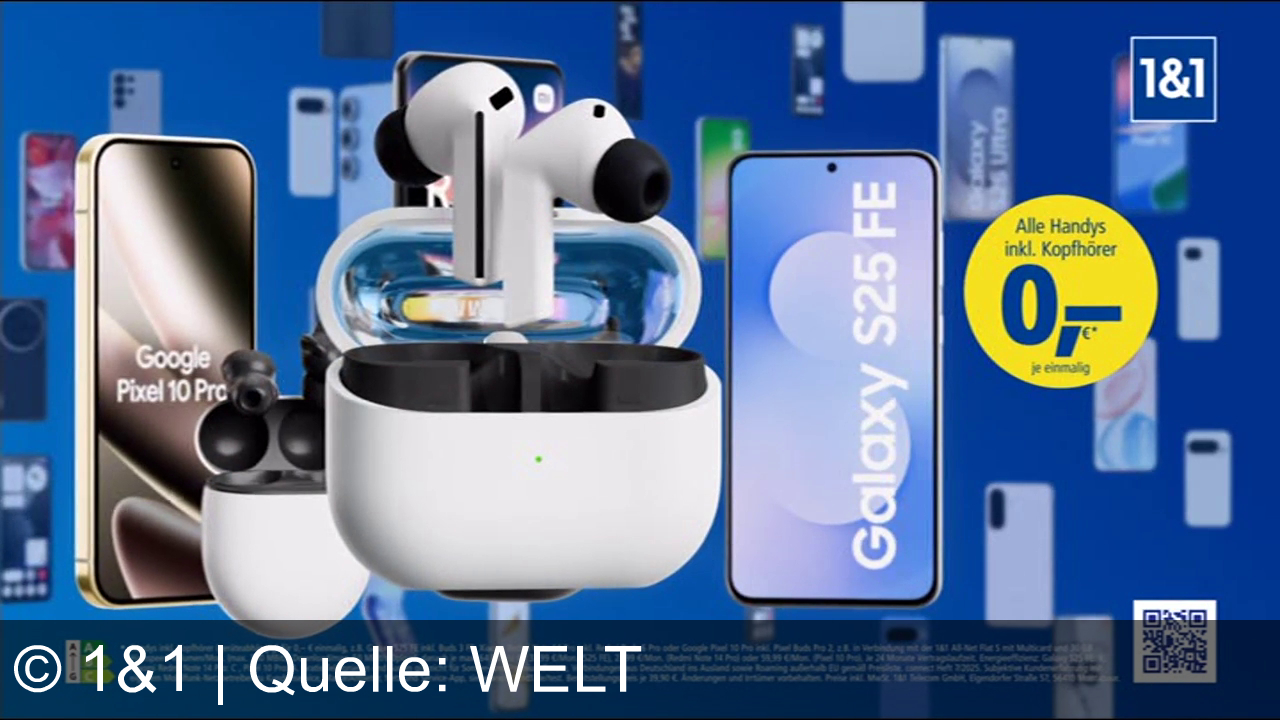 Werbung aus dem Jahr 2025 von 1&1 in Deutschland, mit dem von uns gewählten Titel: "1&1: Gratis kabellose Kopfhörer zu Top-Smartphones – ausgezeichnetes Netz und Service sichern" mit der Kurzbeschreibung: "Jetzt sind passende Kopfhörer immer inklusive! Galaxy S25 FE, Redmi Note 14 Pro & Google Pixel 10 Pro bei 1&1 – alle Smartphones mit Kopfhörern für 0 €. Testsieger für Kundenzufriedenheit und Netz: Jetzt zu 1&1 wechseln!". Diese Werbung thematisiert oder beinhaltet die Kategorie/n Kopfhörer, Handy-Smartphone, Mobilfunkvertrag.