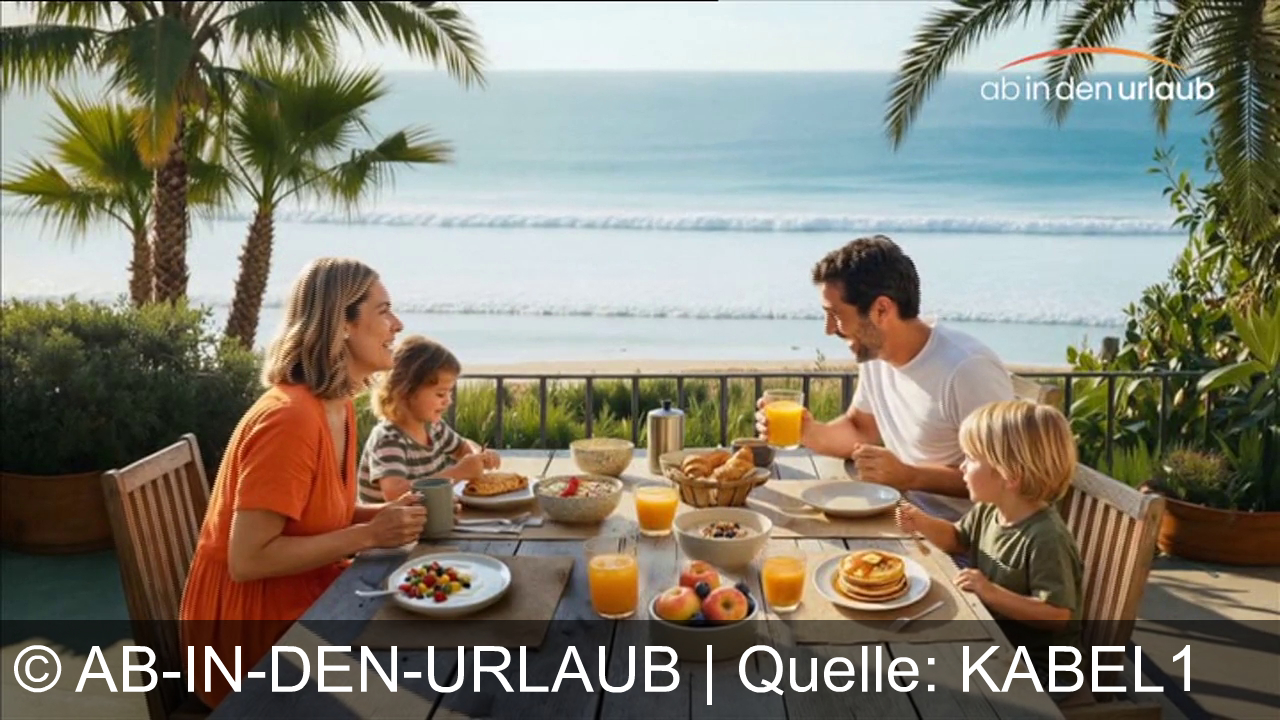 Eine Familie sitzt an einem Holztisch auf einer Terrasse am Meer. Links eine Frau in einem orangefarbenen Kleid, gegenüber ein Mann im weißen T-Shirt. Zwei Kinder sitzen dazwischen. Frühstück mit Orangensaft, Obst und Pfannkuchen auf dem Tisch. Im Hintergrund sind Palmen und das Meer mit einer kleinen Welle zu sehen. Oben rechts steht "ab in den urlaub".