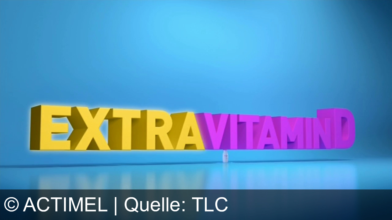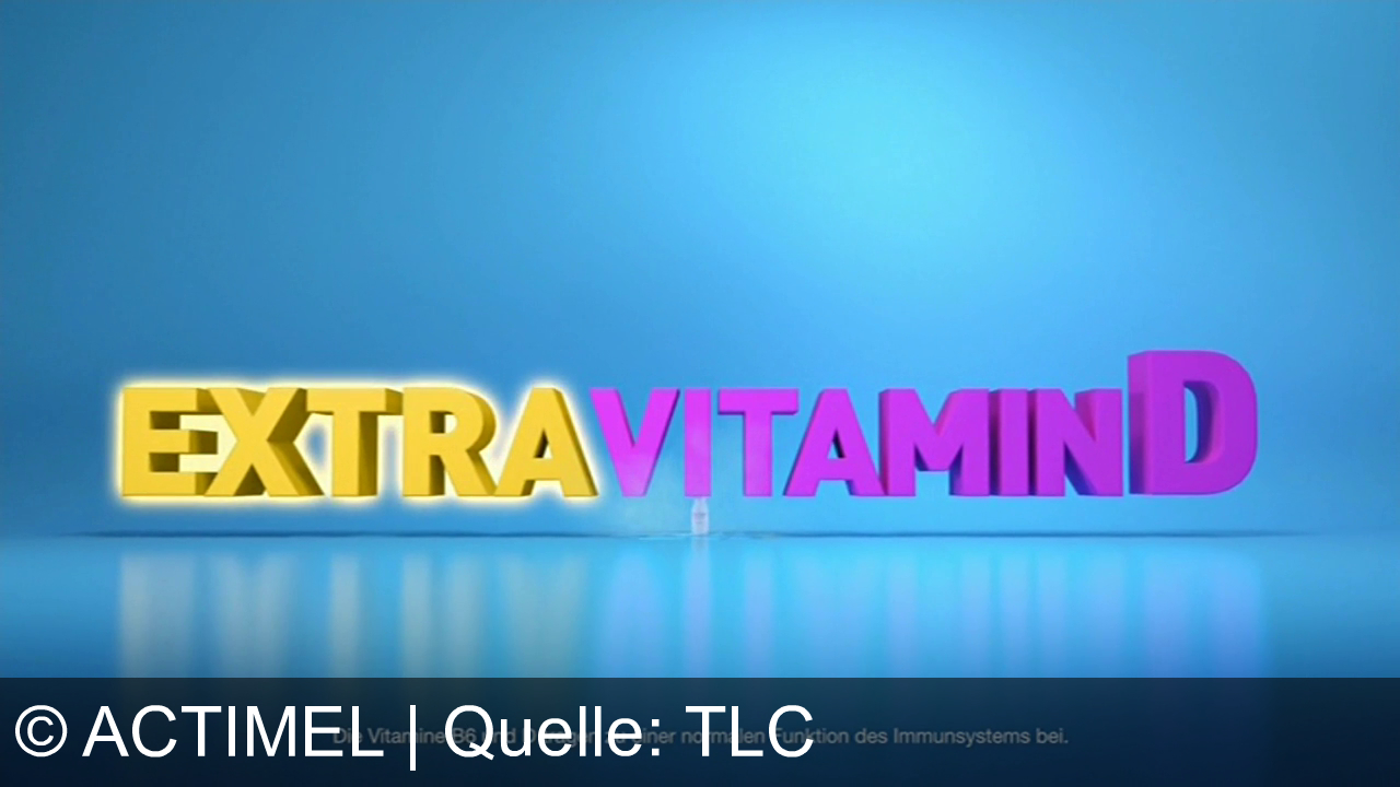 Großer Text in gelb und lila: "EXTRA VITAMIN D". Blauer Hintergrund, Spiegelung des Textes auf dem Boden. Unten kleiner Text: "Die Vitamine B6 und D tragen zu einer normalen Funktion des Immunsystems bei."