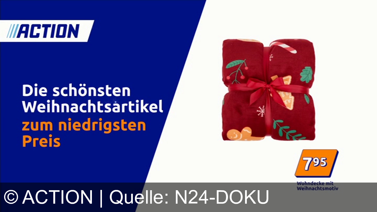 Ein blaues Werbebanner mit "ACTION"-Logo. Links der Text: "Die schönsten Weihnachtsartikel zum niedrigsten Preis". Rechts zwei rote Decken mit Weihnachtsmotiven, zusammengebunden mit einer Schleife. Unten rechts Standpreis 7,95 Euro, Beschreibung: "Wohndecke mit Weihnachtsmotiv".