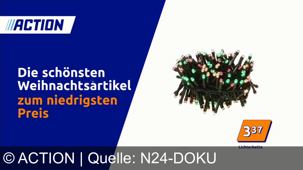 Action bewirbt preiswerte Weihnachtsdeko wie Lichterketten, Kugeln und festliches Geschirr. Die Produkte sorgen für festliche Stimmung zu kleinen Preisen. Die zentrale Werbeaussage: Große Auswahl an Weihnachtsartikeln bei Action – "Kleine Preise, große Freude".