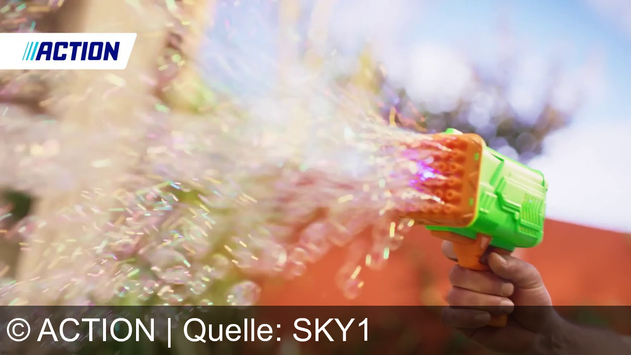 Eine grüne Seifenblasenpistole wird von einer Hand gehalten. Viele Seifenblasen fliegen aus der Pistole. Oben links steht „ACTION“ auf weißem Hintergrund. Im Hintergrund sind verschwommene Farben.