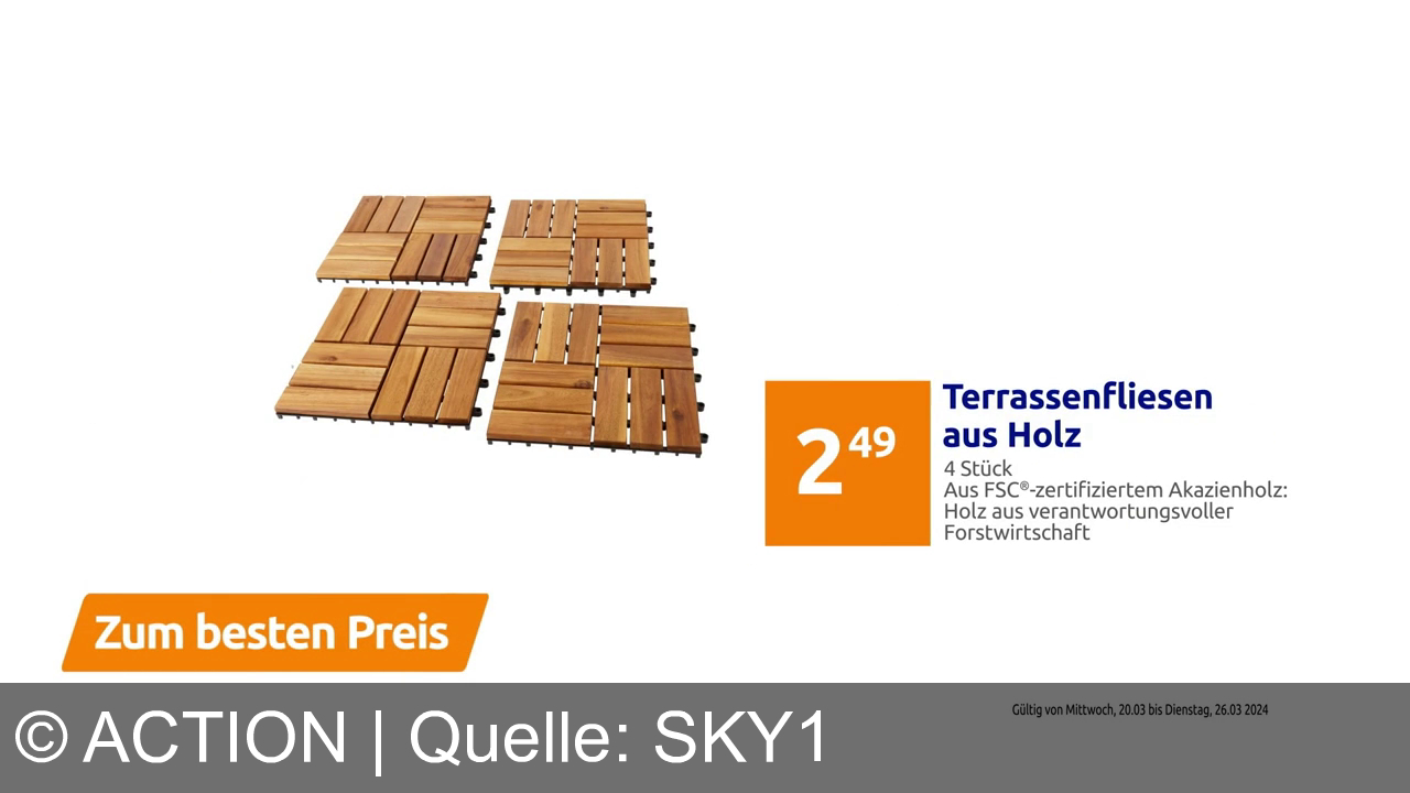 Vier Holzfliesen aus Akazienholz, FSC-zertifiziert, Preis 2,49 Euro für 4 Stück. Text: "Terrassenfliesen aus Holz," "Holz aus verantwortungsvoller Forstwirtschaft." Links unten "Zum besten Preis," Gültigkeit: Mittwoch, 20.03 bis Dienstag, 26.03.2024.