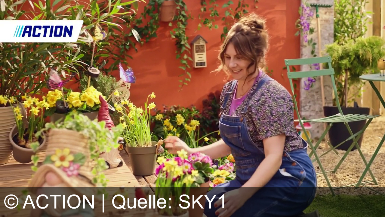 Eine Frau in Latzhose sitzt im Garten und topft Blumen ein. Um sie herum stehen viele bunte Blumentöpfe, Gartenzwerge und Dekorationen. Im Hintergrund sind Pflanzen und ein orangefarbener Zaun zu sehen. Ein grüner Klappstuhl steht neben einem Tisch, auf dem Dekorvögel sitzen. Links oben ist das Logo „ACTION“ eingeblendet.