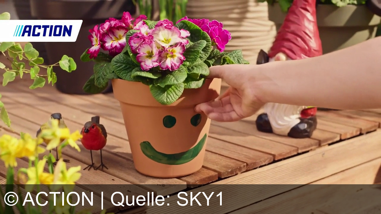Ein Blumentopf mit lächelndem Gesicht, darin violett-weiße Blumen. Eine Hand greift zur Seite des Topfes. Im Hintergrund sind ein Gartenzwerg und zwei Deko-Vögel. Links oben das Logo "ACTION". Die Szene spielt auf einer Holzfläche mit gelben Blumen im Vordergrund.